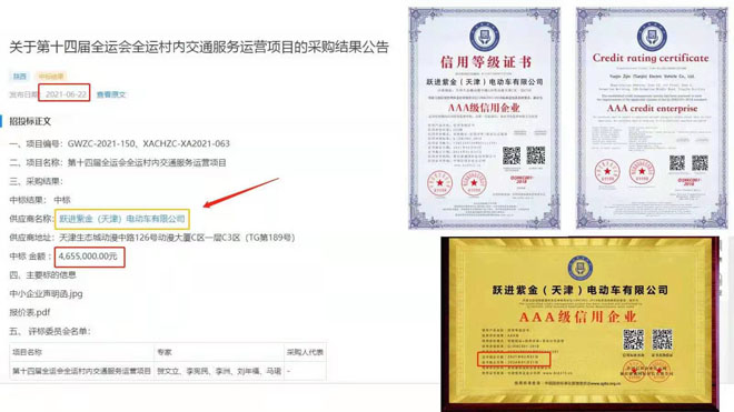一、項目編號:GWZC-2021-150、XACHZC-XA2021-063 二、項目名稱:第十四屆全運會全運村內(nèi)交通服務(wù)運營項目 三、采購結(jié)果: 中標結(jié)果: 中標 供應(yīng)商名稱:躍進紫金(天津)電動車有限公司 供應(yīng)商地址:天津生態(tài)城動漫中路126號動漫大廈C區(qū)一層C3區(qū)(TG第189號) 中標 金額 : 4,655,000.00元